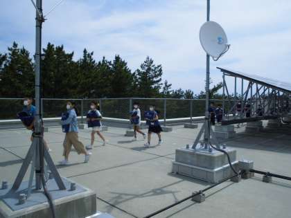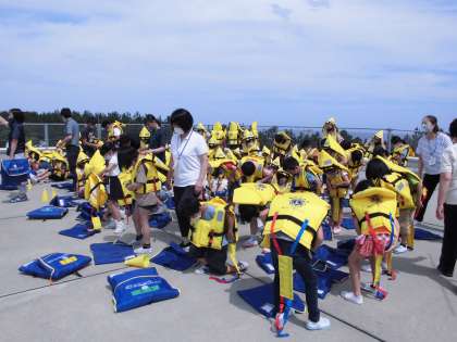 その後、大津波警報が発令されたということで、津波に備えてライフジャケットを持ち、北館の屋上へ避難しました。そして、実際に身に付けてみました。