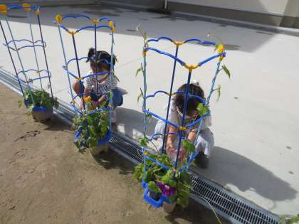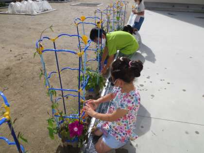 1年生が育てているアサガオが今朝咲きました。前日つぼみを見付け、「明日咲くかな」と楽しみにしていました。これからきっと、たくさん花を咲かせてくれるでしょう。毎朝楽しみです。