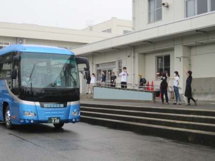 一緒に同行してくださる教育ボランティアの皆様と顔合わせをして、校長先生に出発のあいさつをしました。バスに乗って、7時30分出発しました。
