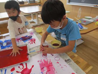トイレットペーパーの芯やプリンのカップ等持ち寄った材料でスタンプしたり、ローラーを転がしたりしました。手をスタンプして感触を楽しむ子供もいました。