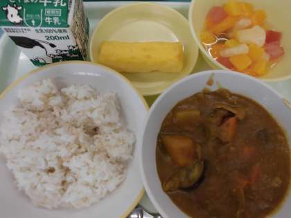 人気のカレーの日です。今日のカレーは、夏野菜のカレー。カボチャやピーマン、なすが入っていました。トマトも入っていたのに気が付きましたか?