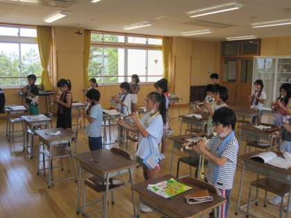 3・4年生は、合同で歌や合奏に取り組んでいます。今日は、3年担任を招待してミニ発表会をしていました。元気のいい歌声で、とてもはりきっていました。
