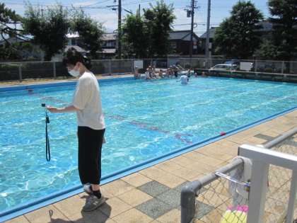 本校では、養護教諭が時間を決めて、黒球式熱中症指数計を使い暑さ指数(WBGT)を測定しています。場所は、グラウンド、体育館、1階廊下等です。
