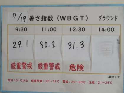 本日は、朝からその指数が高く、12時30分にはグラウンドにおいて指数が危険の31を越えたので、外での活動を中止しました。なお、教室はエアコンを使い、換気をしながら室温を快適に保っております。