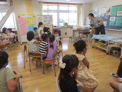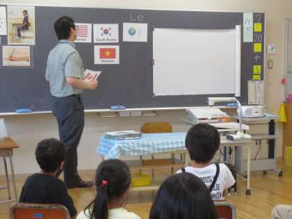 3時間目に1・2年生で英語の学習をしました。先生に質問したりみんなでクイズをしたりALT先生の英語に一生懸命に耳を傾けていました。「ワン、ツー」と数を英語で言ったり、「いちごはストロベリーだよ」と言ったり、英語で話すことの楽しさを感じることができました。