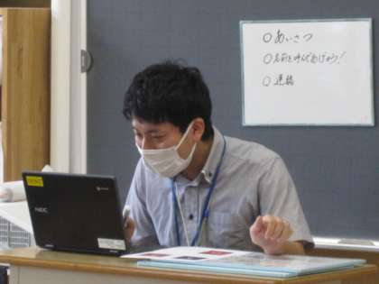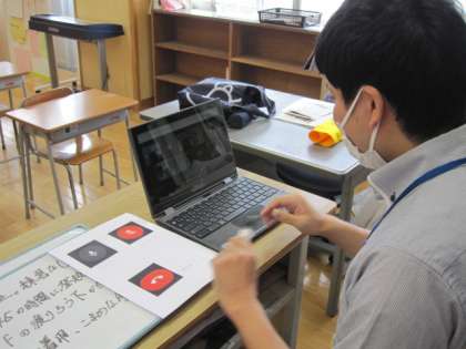 オンラインによる朝の会では、担任が、ホワイトボードやあらかじめ用意したアイコンの画像を使って、マイクのオンオフ等を説明して、オンラインの仕方について説明しました。そして、健康観察で1人ずつ声を出したり、手をあげたり振ったりして元気な様子をみんなで共有しました。