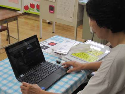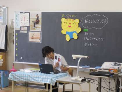 1年生の様子です。画面に子供たちの顔が並んで映っていることに感激しました。まだまだ操作が慣れていない子供たちですが、なんとか朝の会ができました。
