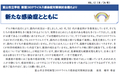 2学期の開始にあたって富山市教育長から保護者の皆様に向けた文書と「新たな感染症とともに 富山市立学校 新型コロナウイルス感染症対策検討会議だより」12号が昨日発行されました。印刷したものは8月27日(金)に子供たちを通して保護者の皆様に配布する予定にしています。