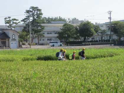 5年生が植えた学校田の稲は、ずいぶん大きくなりました。(写真下)