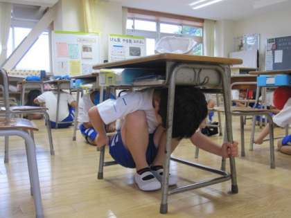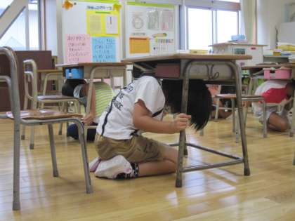 地震発生時の音が放送で流れると、子供たちは机の下などの安全な場所で、頭や身体を守り机の脚をしっかりと持って揺れがおさまるまでを体験しました。