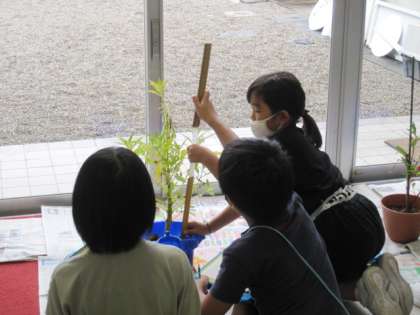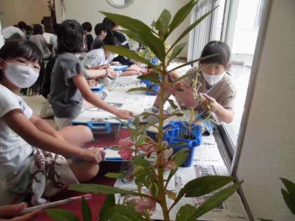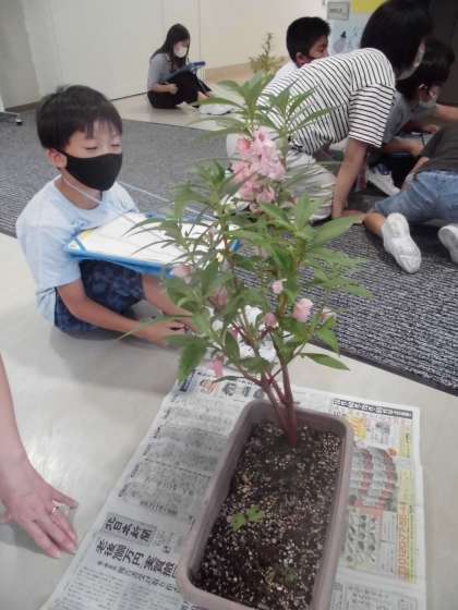 今日、立派に育ったほうせんかの花と実の観察をしました。花と茎の色の関係や種はどこから出てくるかなど、子供たちはいろいろなことを楽しんで見つけました。