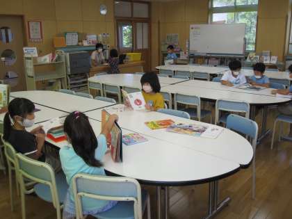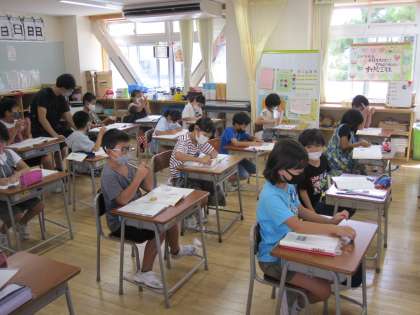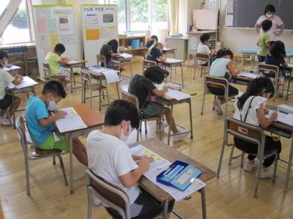 2年生は漢字練習。鉛筆をしっかり持って書いています。