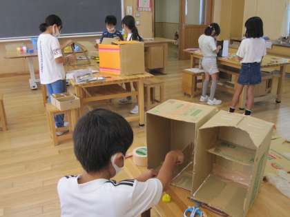 4年生は図工。ダンボールボックスづくりです。豊かな発想にワクワクします。
