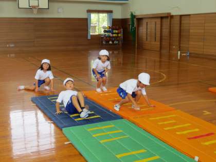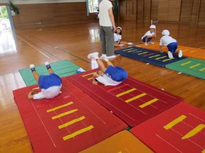 体育で「マットあそび」をしています。動マットの上で動物になって歩いたり、ゆりかごのようにゆらゆら転がったりしています。今日は「まえころがり」に挑戦しました。