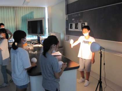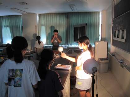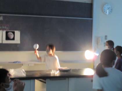 6年生は、模型を使って月の満ち欠けを実験に取り組みました。1人ずつ順番に体験してみると、歓声とともに満ち欠けの様子を実感しているようでした。