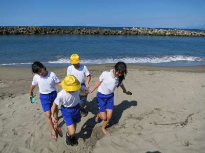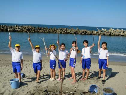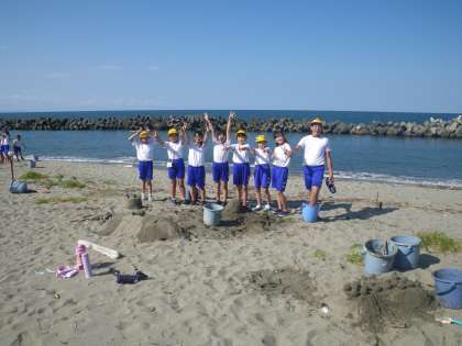 5〜6時間目に、砂浜で造形遊びを行いました。「最高学年らしい本気の砂遊びをしよう」という学習課題に6年生は喜びました。グループに分かれ、作品に合うような材料を手分けをして見つけたり、アイデアを出し合って形を工夫したりするなど、楽しみながらも集団として高まろうとする気持ちを感じました。