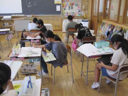 6年生は図工。植物を丁寧に書くためにクロムブックも活用していました。