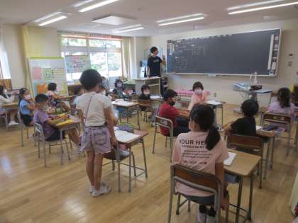 子どもたちは、関連のある商品は近くに置いてあることや、果物や野菜の産地など、気づいたことをたくさんノートに書いて発表していました。