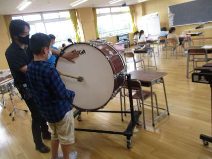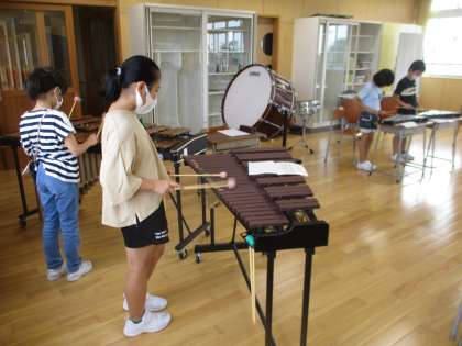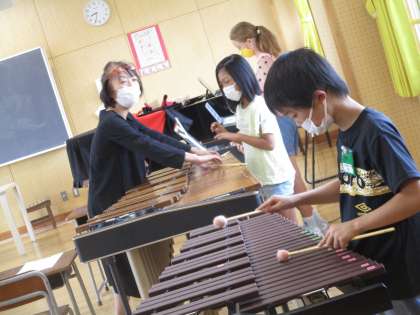 合奏の練習に励んでいます。打楽器の基本的な演奏の仕方を教わったり、「タンタタ、タタタ、タッタタン」等、たくさんのリズムに慣れ親しんだりしています。休み時間にも練習をしている子もおり、上手に弾けるようになりたいという意欲が伝わってきます。