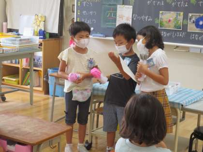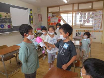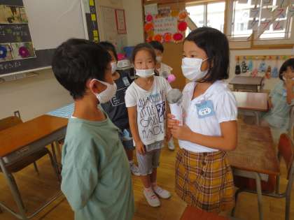 今日は、「たのしいバースデー」係がバースデー会を企画しました。6月生まれと9月生まれの友達をお祝いしました。みんなで歌を歌ったり、お手製のマイクでインタビューをしたりして楽しい会になりました。