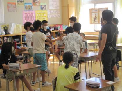 4年生は3年生と一緒に芋掘りをしていました。大きな芋が出てくると歓声が上がります。今年は順調な育ち具合です。