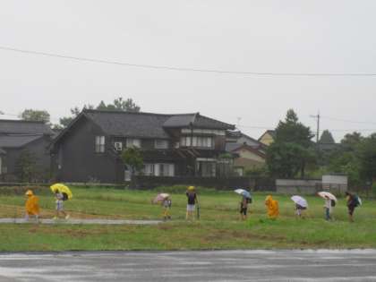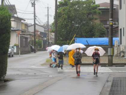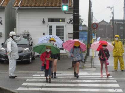 久しぶりに雨の朝となりました。1年生は雨合羽を着ての登校です。
