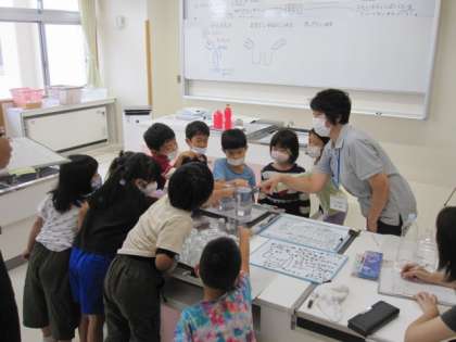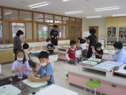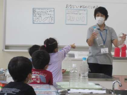 2つのペットボトルに入る水のかさを比べる問題で、直接比較、間接比較、任意比較等、いろいろな比較の方法を考え、話し合いました。実際に実験でやってみると「おもしろかった」「楽しかった」と、考えることに対して意欲が高まった様子でした。対話的な授業づくりを目指し、研修を続けていきたいと思います。