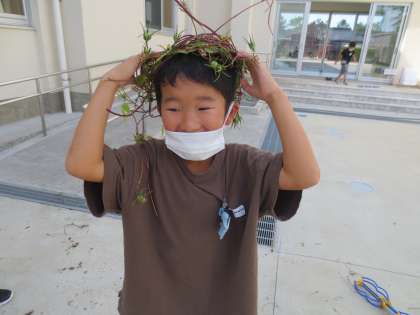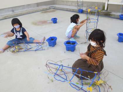 あさがおの種を取り終わり、つるを使ってリースを作ります。まずは、グルグルと支柱に巻きついたつるを外しました。