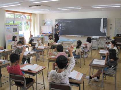 1年生はALTの先生から動物の鳴き声を学んでいます。