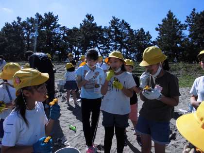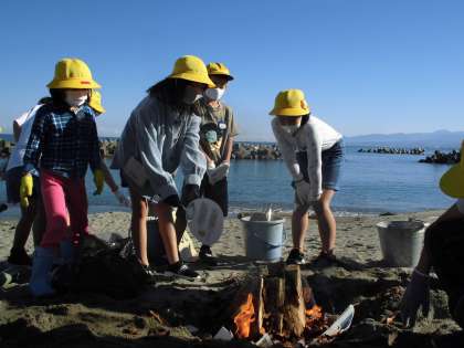 今日は、朝からシーサイド焼き芋です。前日、1・2年生が洗った芋を3・4年生が包み、当日の朝、浜辺に穴を掘って火をつけました。火の番は、5・6年生がしました。