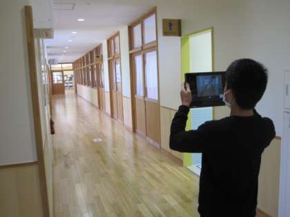 6年生は図工。遠近法などの図法を使って「思い出の校舎」を描くために、クロムブックを利用して構図を考えています。