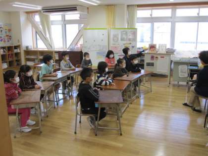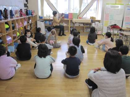 今日は金曜日。朝の読み聞かせの日です。読み聞かせの会の方々の声を静かに聞いていました。