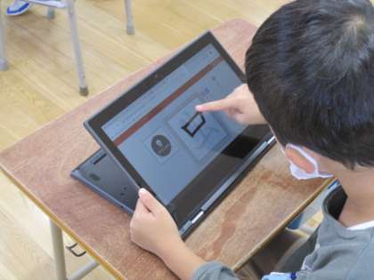 1年生は読み聞かせを待つ間、クラウドドリルで漢字の書き順の学習をしていました。