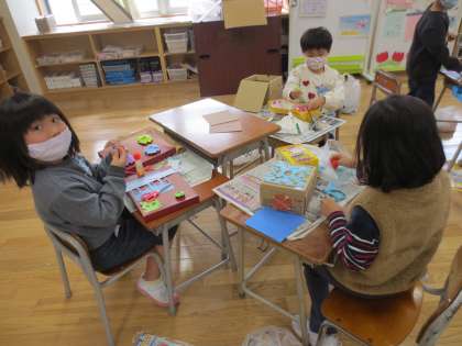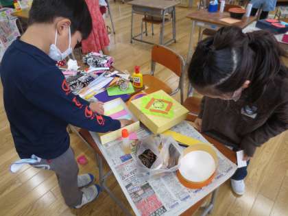 「かざって なにいれよう」の活動です。持ち寄った材料を使って箱を飾り付けました。