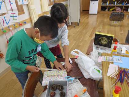 「秋のものを入れよう」「かわいい物を入れたい」と中に入れる物に合わせて飾りを工夫していました。