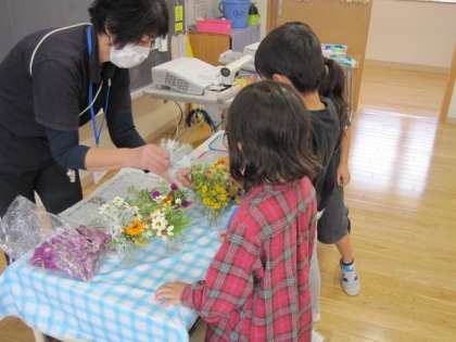 1年生は花びんに花を飾っていました。