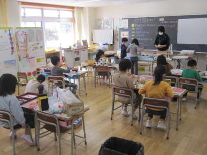 1年生は「かざってなにいれよう」と入れ物の飾りを考えていました。