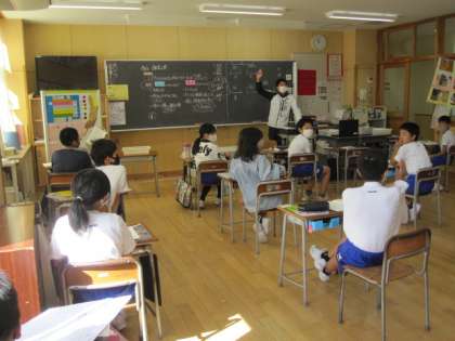 3年生は算数。先生が書画カメラでコンパスの使い方を見せています。