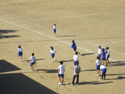6年生は体育。グラウンドで気持ちよく走っていました。