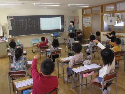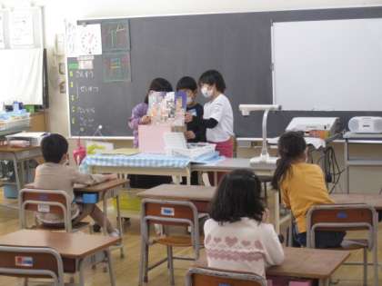 1年生は紙芝居をしています。大きな声で読んでいます。