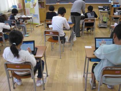 5年生は算数。「速さを求めよう」クラウドドリルを使って問題練習です。