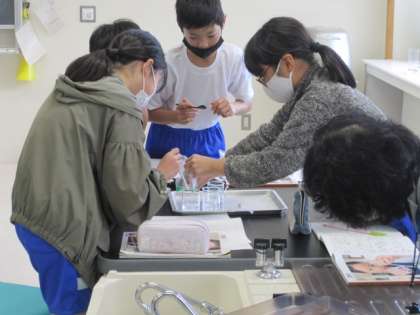 5年生は理科。物を水に溶かしてみる実験です。