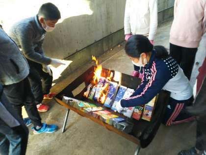 4年生のカートンドッグが出来上がりました。具材はさみや火付けにはかなり手こずりました。そして、やっと食べることができたカートンドッグ。朝陽を浴びながらそれをほお張る笑顔は格別の表情です。