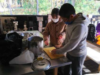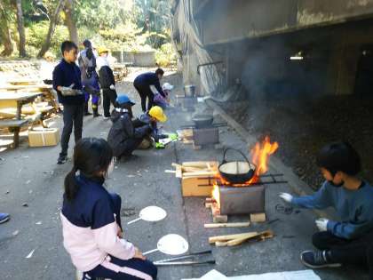 5年生の活動。野外炊飯です。班で協力して具材を切ったり、火の加減を調節したりと順調に進んでいます。生き生きと活動しています。