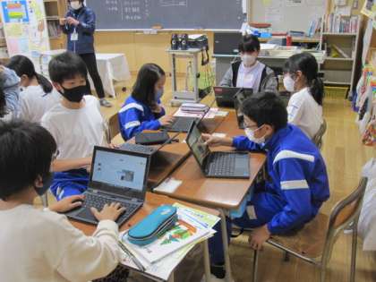 5年生もクロムブックを使用して、宿泊学習の思い出をスライドにまとめています。