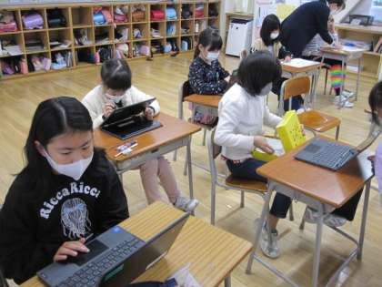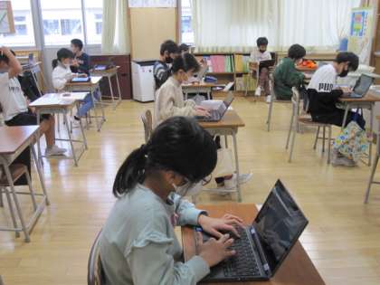 5年生は宿泊学習のスライドづくりです。完成が近づいているようです。