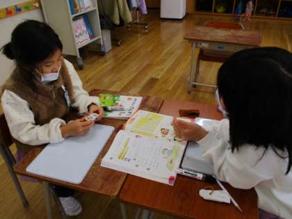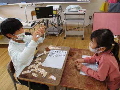 ひき算カードでペアで問題を出し合っています。まだまだすぐには答えられませんが、ボードを使って計算しています。これからも繰り返し練習して、ひき算名人を目指します。