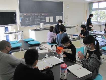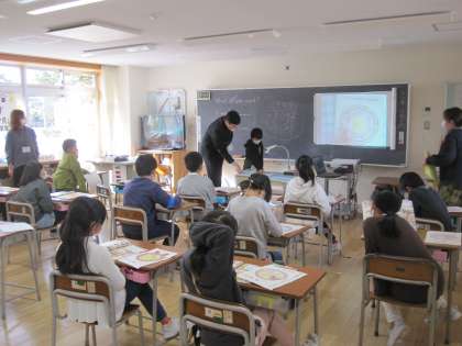 5年生は理科。塩やミョウバンを水に溶かす実験です。