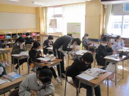 5年生は国語。グループに分かれて、「やなせたかし-アンパンマンの勇気」を読んでいます。