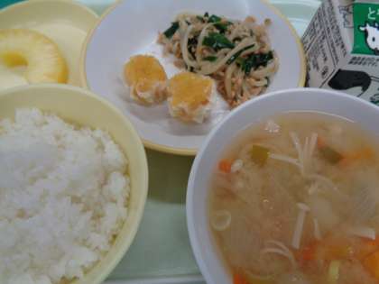今日は、スタミナ納豆という新メニューが出ました。少し勇気がいりましたが食べてみるととてもおいしかったです。ごはんにのせて食べる人もいました。カットパインもとても甘かったです。
